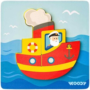 Puzzle WOODY Puzzle Baby Lodička Masivní puzzle pro nejmenší děti Složeno z pěti velkých kousků, které se dají snadno uchopit Na základně hrací desky vytištěna černobílá kresba Ta usnadní orientaci a …