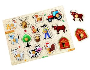 Dětské puzzle ze dřeva. Dílky jsou umístěny na dřevěné podkladové desce s vyfrézovaným okrajem pro snazší skládání.