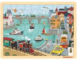 Dřevěné puzzle se 100 dílky na dřevěné desce s pevným okrajem, která slouží zároveň jako podložka pro skládání.