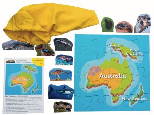 Just Jigsaws 774 Austrálie a její zvířata - dřevěné puzzle 16 dílů a 10 zvířat je vzdělávací sada, jejímž smyslem je seznámit děti s jednotlivými kontinenty a jejich faunou.