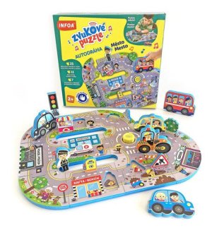 Vzdělávací hračka s 8 pěnovými kartičkami, 7 vyjímatelnými zvířátky, známými melodiemi a zvuky hospodářských zvířat.