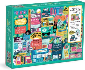 Puzzle Hlavní ulice naděje obsahuje nápisy v angličtině , které inspirují k objevování různých způsobů a možností, jak být veselejší, optimističtější, kurážnější a štastnější.