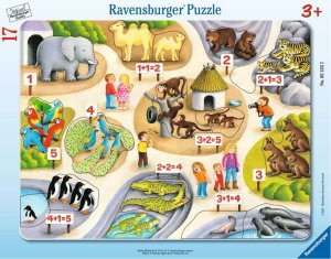 Dětské deskové puzzle s početními úkoly (dílky se skládají přímo na přiloženou podložku s rámečkem).