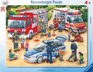 Dětské deskové puzzle (dílky se skládají přímo na přiloženou podložku s rámečkem) s motivem policistů, hasičů a záchranné služby.