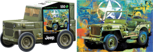 Puzzle v plechové krabičce ve tvaru vojenského džípu.