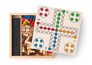 Soubor stolních her v dřevěném boxu, jehož víko tvoří oboustranná hrací deska pro jednotlivé společenské hry – šachy, dáma, nebo člověče, nezlob se.
