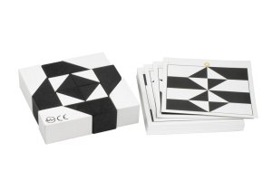 Černobílý tangram, logická hra pro jednoho hráče. Černobílé kameny je nutné stavět dle předlohy tak aby zaplnili plochu čtverce dle papírových předloh.