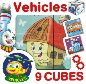 Plastové obrázkové kubusy s obrázky dopravních prostředků a domečkem.