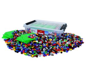 Praktický úložný box obsahuje celkem 4000 dílků Plus-Plus v základních barvách a 12 zelených podložek.