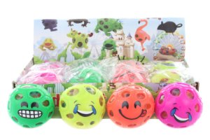 Míček antistresový o rozměrech 8 cm x 5 cm s veselým obličejem a vlásky.