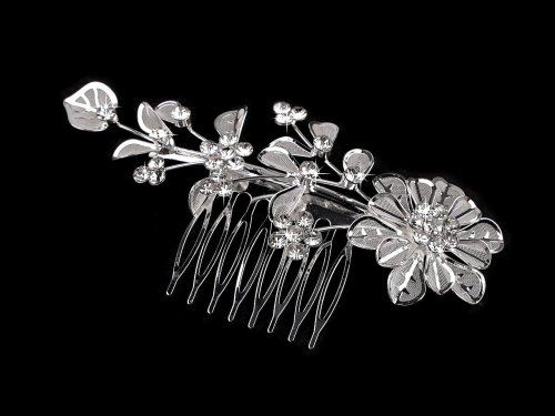 Kovový hřeben do vlasů s kovovým květem s větvičkou je ozdobený broušenými kamínky, díky kterým se poutavě třpytí. Oslní na každé slavnostní události ve společenském účesu, ale je vhodný i na běžné nošení. Samotný hřeben je rovný, ozdoba je jemně prohnutá. V účesu hřeben pevně drží.