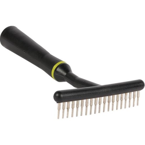 Hrablo Groom Undercoat Rake je vhodné k rozčesávání zacuchané a zaplstěné srsti a ideální k vyčesávání línající srsti a husté podsady dlouhosrstých plemen. Kulaté kovové zuby (17 mm) se zaoblenými konci chrání a masírují pokožku. Válcovitá hlava potažená plastem brání hromadění statického náboje. Rukojeť je ergonomická (tvarovaná pro pohodlný úchop). Česání usnadňuje i mírně nakloněná hlava hrabla. Rozměry (cca): 12 × 19 cm Hmotnost (cca): 90 g Upozornění: Uchovávejte mimo dosah dětí. Zjistíte-li poškození, přestaňte nástroj používat.