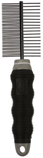 Oboustranný hřeben s kulatými zuby, které zabraňují podráždění pokožky psa. Z jedné strany jsou zuby husté a z druhé jsou středně husté zuby. Tento oboustranný hřeben je vhodný pro každodenní rozčesávání, přípravu na stříhání, rozčesávání zacuchaných chloupků a vyčesávání podsady. Rukojeť je pogumovaná a tvarovaná pro pohodlné držení v ruce. Velikost: 20 x 5 cm, délka zubů 2,5 cm 35 + 18 zubů