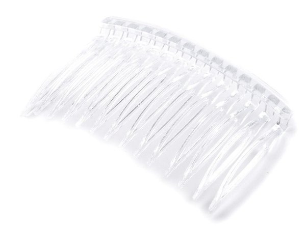 Plastové hřebínky do vlasů o rozměru 45 x 70 mm v krystalové [barvě. Můžete si je] dotvořit podle vlastní fantazie. Můžete je ozdobit štrasem, hotfixovými kamínky či jinou zajímavou ozdobou. Vhodné jsou také do kadeřnických salónů. Při velmi šetrném zacházení se dají použít také k rozčesávání vlasů.