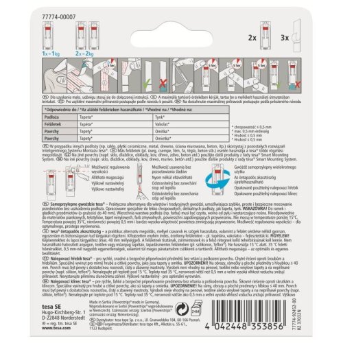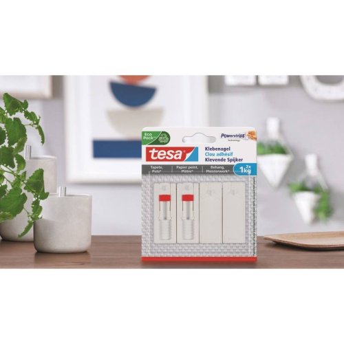 • Nastavitelný nalepovací hřebík na tapety a omítku tesa® 1 kg unese – jak název napovídá – zátěž až 1 kg (nebo 2 kg, pokud použijete dva hřebíky)