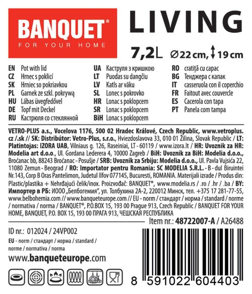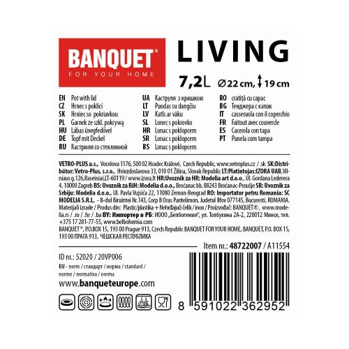 Hrnec 22 cm, se skleněnou poklicí, 7,2 l, nerez, LIVING.