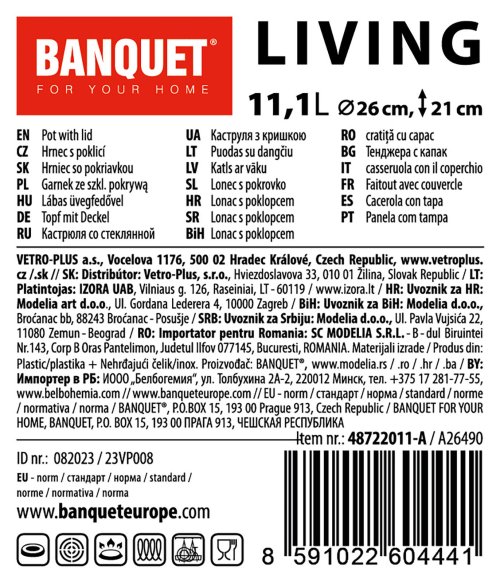 Nerezový hrnec LIVING se skleněnou poklicí, nerezovým knobem a držadly. Lesklý povrch uvnitř i vně, vnější strana má tři matné pruhy. Hrnec lze použít na všechny typy varných desek včetně indukce.