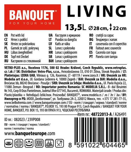 Nerezový hrnec LIVING se skleněnou poklicí, nerezovým knobem a držadly. Lesklý povrch uvnitř i vně, vnější strana má tři matné pruhy. Hrnec lze použít na všechny typy varných desek včetně indukce.