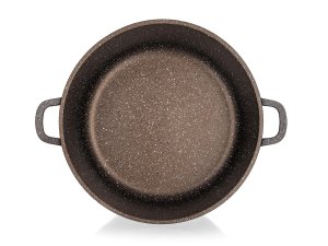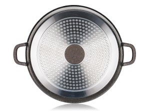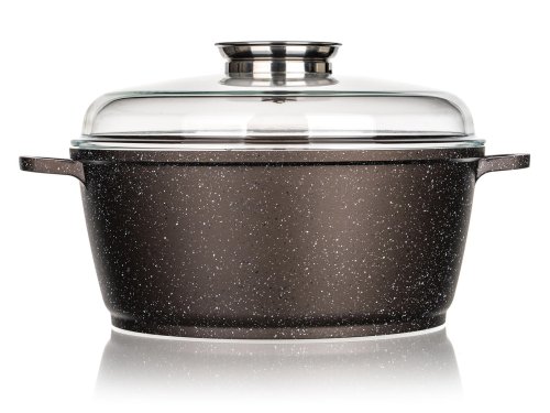 průměr: 28 cm výška: 12,5 cm tloušťka stěny: 1,7 mm nepřilnavý povrch barva: hnědý granitový dekor plně indukční dno skleněná poklice s aroma knoberm