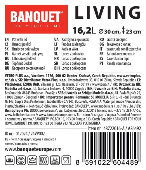 Nerezový hrnec LIVING se skleněnou poklicí, nerezovým knobem a držadly. Lesklý povrch uvnitř i vně, vnější strana má tři matné pruhy. Hrnec lze použít na všechny typy varných desek včetně indukce.