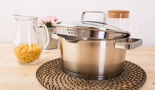 Obrovskou výhodou oproti běžně používaným hrncům je výparník/cedník, kterým jsme osadili poklici hrnce. Už si nepopálíte ruce při slévání horké vody z brambor či těstovin. Pro rychlejší uvedení surovin k varu jen pootočíte poklicí a výparník/cedník se uzavře.