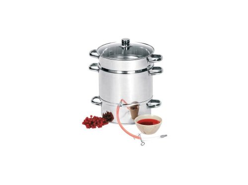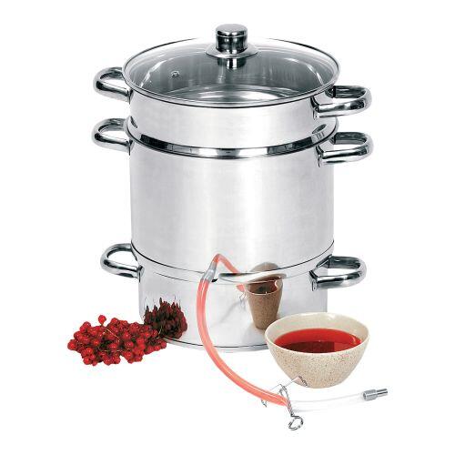 Velký nerezový hrnec na odšťavňování, vhodný pro přípravu domácích šťáv a marmelád. Hrnec je skladný, jednotlivé díly do sebe zapadají."