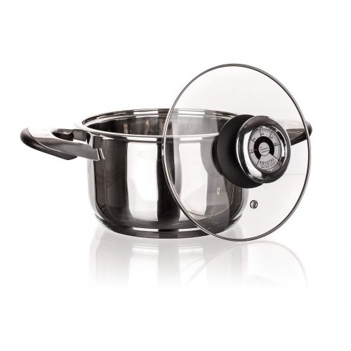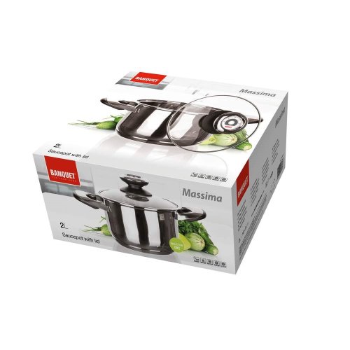 Nerezový hrnec se skleněnou poklicí MASSIMA 2 l, rozměry - průměr 18 cm, výška 9 cm, nerezové tělo 0,5 mm, dno - nerez, hliník, indukční protektor. Povrchová úprava - lesk (uvnitř i vně), vnitřní strana s měrkou objemu. Držadla a knoby v kombinaci plast - nerez, knoby s termometrem. Hrnec lze používat na všechny typy varných desek.