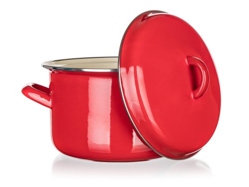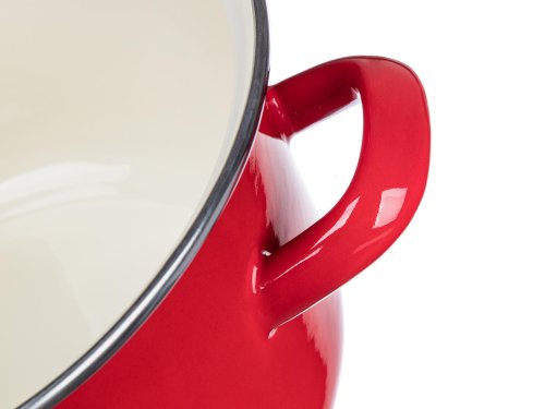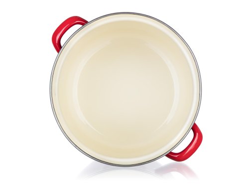Poklice i hrnec s červenou smaltovanou glazurou, černým dnem na vnější straně, s krémovou barvou na vnitřní straně. Hrnec lze používat na všechny typy varných desek včetně indukce.