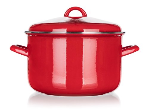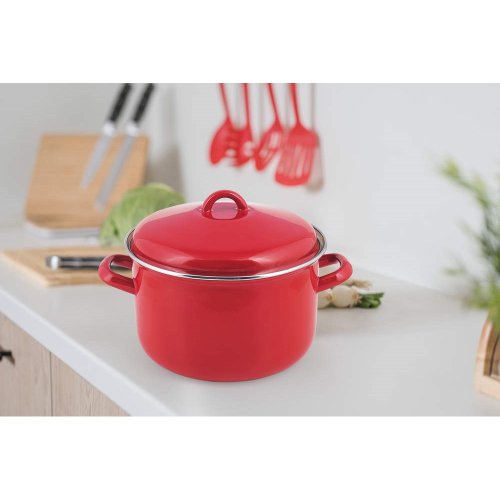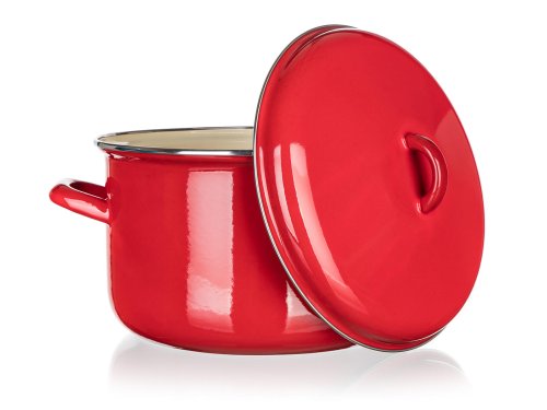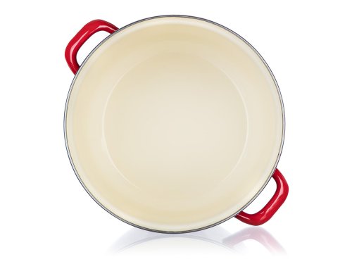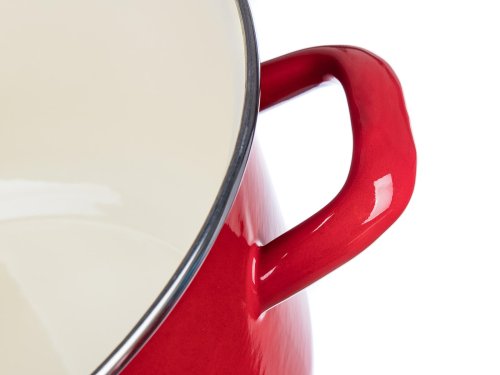 Poklice i hrnec s červenou smaltovanou glazurou, černým dnem na vnější straně, s krémovou barvou na vnitřní straně. Hrnec lze používat na všechny typy varných desek včetně indukce.