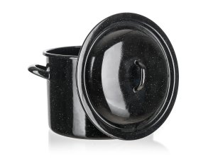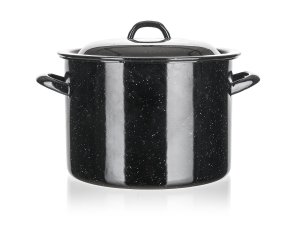 Smaltovaný hrnec se skleněnou poklicí. Hrnec lze používat na všechny typy varných desek mimo indukce.