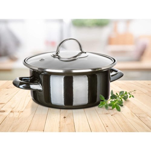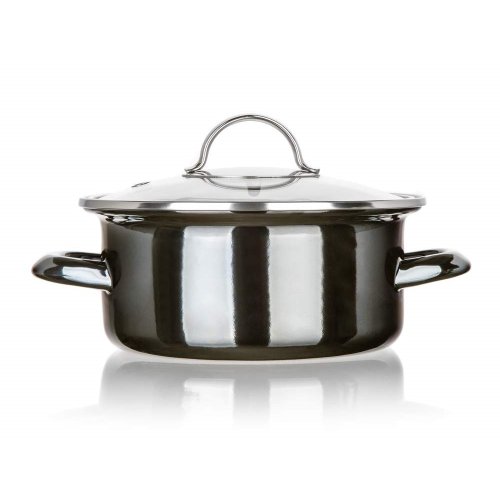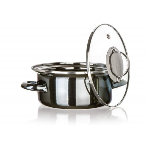 Smaltovaný hrnec se skleněnou poklicí. Průměr 18 cm, výška (bez poklice) 8 cm, síla stěny 0.8 mm. Hrnec lze používat na všechny typy varných desek včetně indukce. Hrnec není vhodný do myčky nádobí, trouby a mikrovlnky. EAN 8591022609859