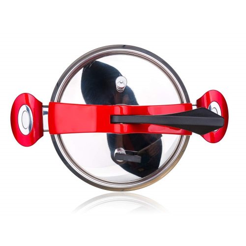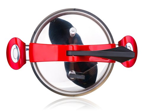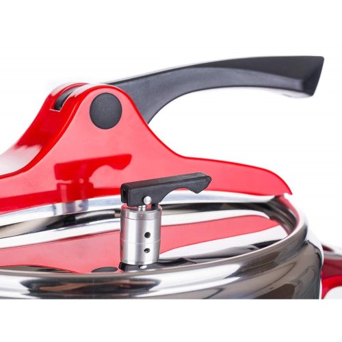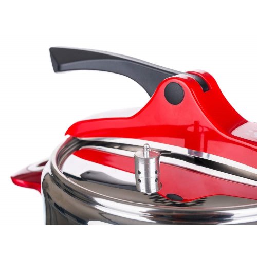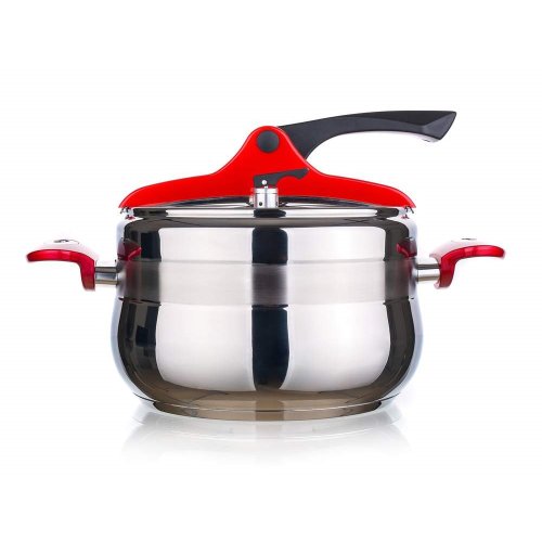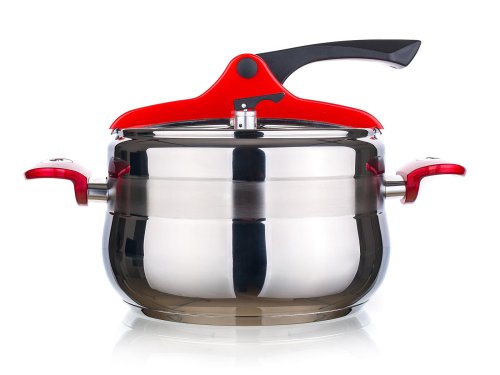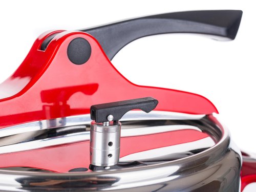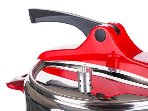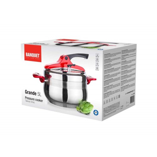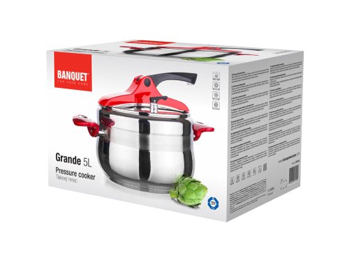 Tlakový nerezový hrnec GRANDE Red 5 l (bezpečný využitelný objem 3,3 l), s pákovým uzávěrem a trendovým baňatým tvarem. Moderní barevné prvky na uzávěru a rukojetích v červené barvě. Tlakový hrnec je vhodný pro rychlou přípravu jídel, šetří čas a energie. Tlakový hrnec je opatřen pojistkami po bezpečné vaření.