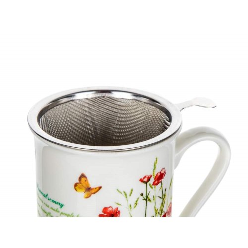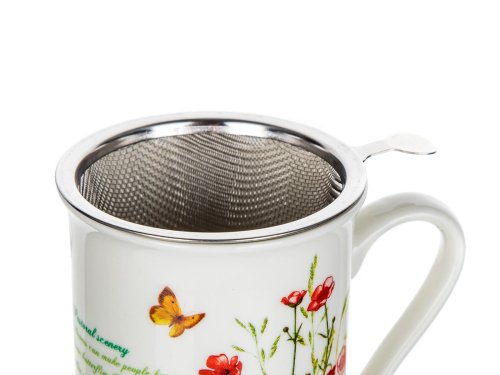 sada obsahuje: 1 x keramický hrnek o objemu 300 ml (výška 10 cm, horní průměr 7,6 cm, dolní průměr 6,9 cm) 1 x nerezové sítko (průměr 7,5 cm, výška 6,5 cm) 1 x keramické víčko / podtácek pod sítko (průměr 8,2 cm)