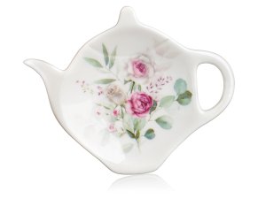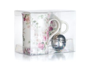 Čajová sada ROSE obsahuje kkeramický hrnek, nerezové sítko a keramický tácek pod sítko