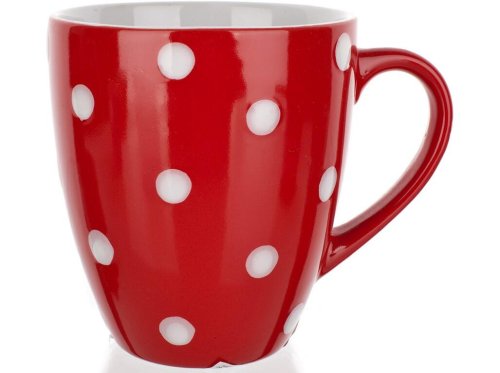 Červený hrnek baňák s puntíky. Hrnek lze používat do mikrovlnné trouby a mýt v myčce na nádobí.