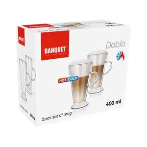Sada skleněných dvoustěnných hrnků DOBLO. Hrnek je vhodný pro podávání studených i horkých nápojů. Dále díky použití dvou stěn vydrží nápoj v hrnku déle teplý než v běžných hrncích. Hrnky jsou vhodné do myčky.
