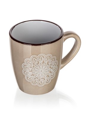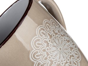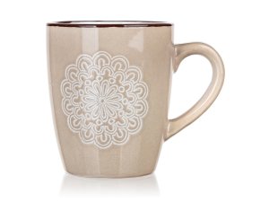 Hrnek SHAPE, v krémové barvě, s dekorem krajky, vyrobený z keramiky. Lze použít do mikrovlnné trouby i do myčky na nádobí na běžné domácí použití.