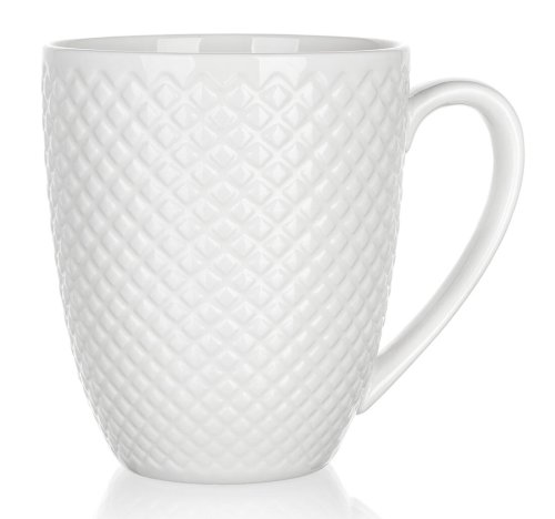 Hrnek DIAMOND 410 ml v barvě bílé se zdobným reliéfem, vyrobený z keramiky. Lze použít do mikrovlnné trouby i do myčky na nádobí na běžné domácí použití.