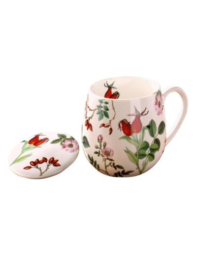 Hrnek včetně nerezového sítka a porcelánového víčka. Materiál: Porcelán Motiv: Originální vzory šípková růže Výška: 89 mm Objem: 420 ml