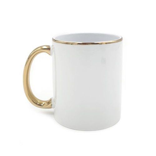 Bílý lesklý keramický hrnek Barevný lem i ucho Vnější strana je opatřena polyesterovou vrstvou Vhodný pro sublimační potisk Výška 95 mm, průměr 80 mm Objem 330 ml Barva zlatá Ideální dárek pro nejrůznější …