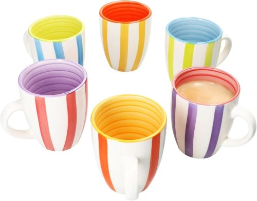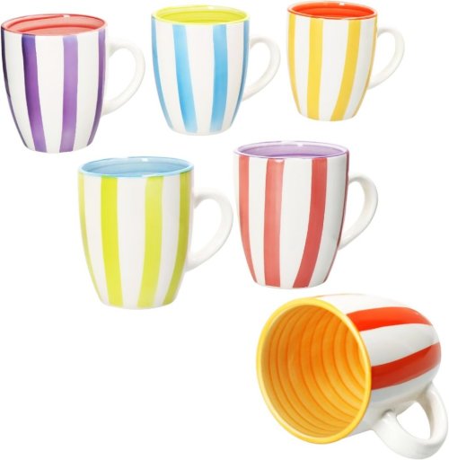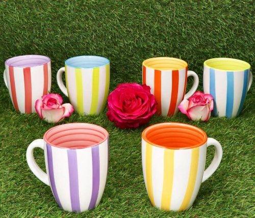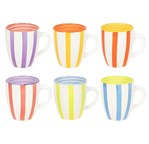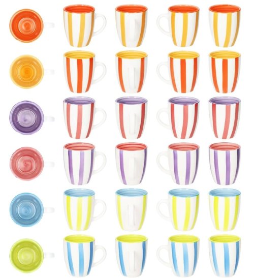 Tato sada obsahuje šest hrnků o objemu 350 ml, všechny v bílém provedení s různými pastelově barevnými pruhy. Vnitřek šálků je barevně glazovaný.