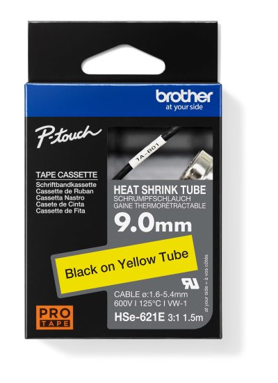HSE-621E - NOVÁ, ŽLUTÁ originální bužírka, smrštitelnost 3:1, šířka 9,0 mm, černý tisk na žluté, délka 1,5 m z řady PRO Tape (design černo-modrého balení)