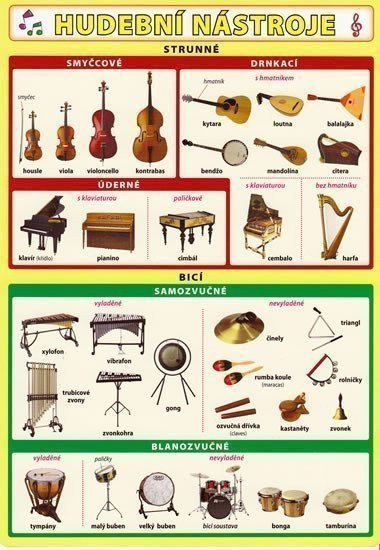 Kvalitní fotografie hudebních nástrojů a jejich základní třídění. Obsahuje nástroje strunné, bicí, dechové a elektrické. Titul rovněž obsahuje schéma symfonického orchestru.