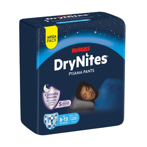 DryNites® natahovací kalhotky na noc pro děti ve věku od 8–13 let a s hmotností 30-48 kg poskytují vašemu dítěti spolehlivou ochranu při nočním pomočování, aby přes noc zůstalo v suchu. Bylo klinicky ověřeno, že přispívají k lepšímu spánku v noci. Mají 5 vrstev, které zajišťují maximální ochranu před protečením, a díky svému jedinečnému designu připomínají běžné spodní prádlo. Zároveň jsou vyrobené z prodyšného materiálu, takže pokožka může volně dýchat. DryNites® natahovací kalhotky na noc umožní vašemu dítěti si bez obav užít zábavu i na dětských táborech, výletech, nebo třeba při přespávání u kamarádů.
