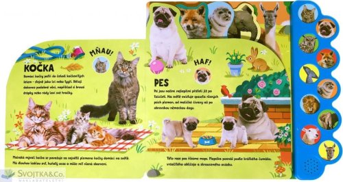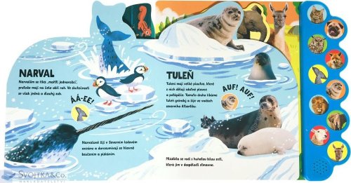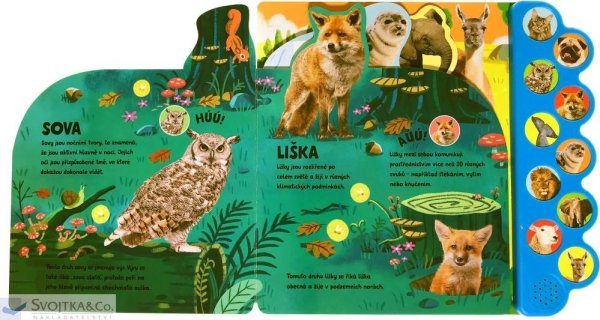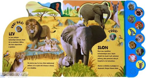 10 zvuků zvířat. Poznej zvířata z celého světa a po stisknutí tlačítka si poslechni, jaké různé zvuky vydávají. Zvuková knížka nabízí dětem možnost poznat zvířata z celého světa za pomoci zvuků. Po stisknutí tlačítka si dítě poslechne, jaké různé zvuky zvířata vydávají, a zvuk si spojí s konkrétním zvířetem. Díky tomu si zvíře lépe zapamatuje a snadno rozezná mezi ostatními. Kniha se tak stává skvělou pomůckou pro rozšiřování základní slovní zásoby a poznávání světa kolem sebe. Víš, jak dělá liška, lev nebo tuleň? Stačí zmáčknout příslušný obrázek na okraji a svět zvířat doslova ožije pod tvýma rukama. Kniha obsahuje tři výměnné baterie.
