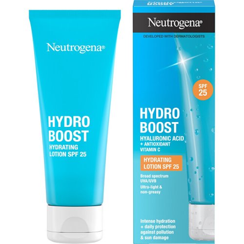 Vhodný pro všechny typy pleti. Náročné podmínky jako znečištění ovzduší, nepříznivé počasí a sluneční záření mohou zhoršit hydrataci pleti a její přirozenou ochrannou bariéru. To často vede k předčasnému stárnutí pokožky a ztrátě jasu. Neutrogena® Hydro Boost Hydratační fluid SPF 25 pleť intenzivně hydratuje, chrání ji před škodlivým UVA/UVB zářením a znečišťujícími látkami z ovzduší a posiluje její přirozenou ochrannou bariéru. Pro zářivou pleť.