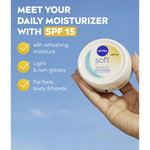 Ikonický hydratační krém Nivea Soft přichází s inovovaným složením a ochranou SPF 15, která chrání pokožku před škodlivými UVA/UVB paprsky způsobujícími předčasné stárnutí a poškození kůže. Tento univerzální krém poskytuje intenzivní hydrataci, výživu a ochranu až na 48 hodin a je ideální pro každodenní péči o obličej, tělo i ruce.