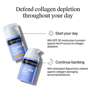 Nemastný, rychle se vstřebávající hydratační krém chrání a podporuje přirozený kolagen pokožky. Nejméně 87 % testujících zaznamenalo zlepšení tónu pleti, pevnosti a pružnosti**, jejichž zhoršení je časným viditelným příznakem poklesu kolagenu. Studie Ex-vivo Vědecké hodnocení u 48 testujících po 12 týdnech, hydratační krém Neutrogena® Collagen Bank SPF 30 ráno a hydratační krém Neutrogena® Collagen Bank Moisturizer večer. VIDITELNÉ VÝSLEDKY BĚHEM 1 TÝDNE 92 % testujících souhlasí s tím, že pleť je OKAMŽITĚ hydratovaná za 1 TÝDEN viděli hladší a rozzářenější pleť VĚDECKY PROKÁZÁNO** 95 % testujících MĚLO pevnější pokožku 87 % testujících MĚLO zlepšenou elasticitu pokožky ***Sebehodnocení, 112 testujících, aplikace dvakrát denně.