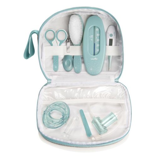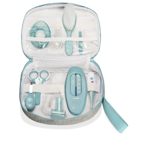 Hygienický set obsahující: 1 nosní odsávačku, 1 hřebínek, 1 nůžky s kulatou špičkou a krytem, 1 pilníček, 1 kleštičky na nehty, 1 silikonový kartáček, 1 digitální teploměr s ohebnou špicí a pouzdrem, …