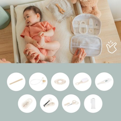 • obsahuje 9 kusů: nosní odsávačku (odsávání pomocí náustku, hleny se shromažďují v uzavřené komoře), kousátko, kartáček na vlásky, kartáček na zoubky, teploměr do vody, rektální teploměr, pilník, kleštičky a kulaté nůžky na nehtíky
